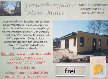 Wir hoffen, dass wir Sie ein wenig neugierig gemacht haben und wir Sie als unsere Gäste in unserem Ferienbungalow "Haus Malte" im Ostseebad Zinnowitz begrüßen zu dürfen.